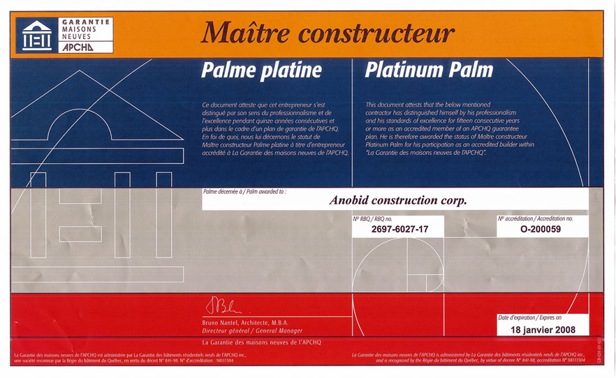 ANOBID est licencié de la Régie du Bâtiment du Québec (RBQ) et Maître Constructeur Palme Platine de l'Association provinciale des constructeurs d'habitations du Québec (APCHQ). ANOBID a oeuvré, entre autres, dans la construction de maisons luxueuses sur mesure et la rénovation, avant de lancer en 1991 un premier projet de maisons évolutives, concept élaboré par l'équipe du Professeur Avi Friedman de l'École d'Architecture de l'Université McGill. Ce concept a été mis à profit pour les projets de St-François, du Boisé d'Auteuil et de l'Allée Chomedey, tous trois à Laval, Québec.