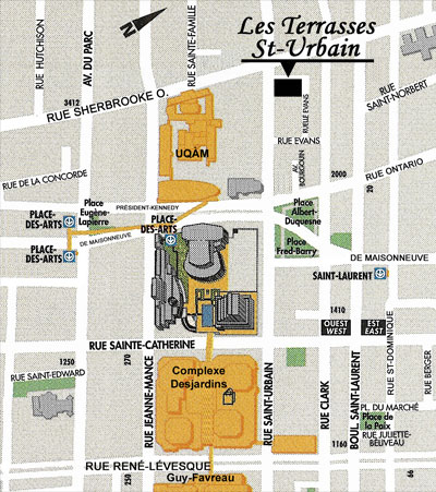 Le projet des Terrasses St-Urbain est situé près du secteur branché de la rue St-Laurent à deux pas du centre-ville, de la Place des Arts et des Universités UQÀM et McGill. A distance de marche de tous les services dont le métro situé au coin.